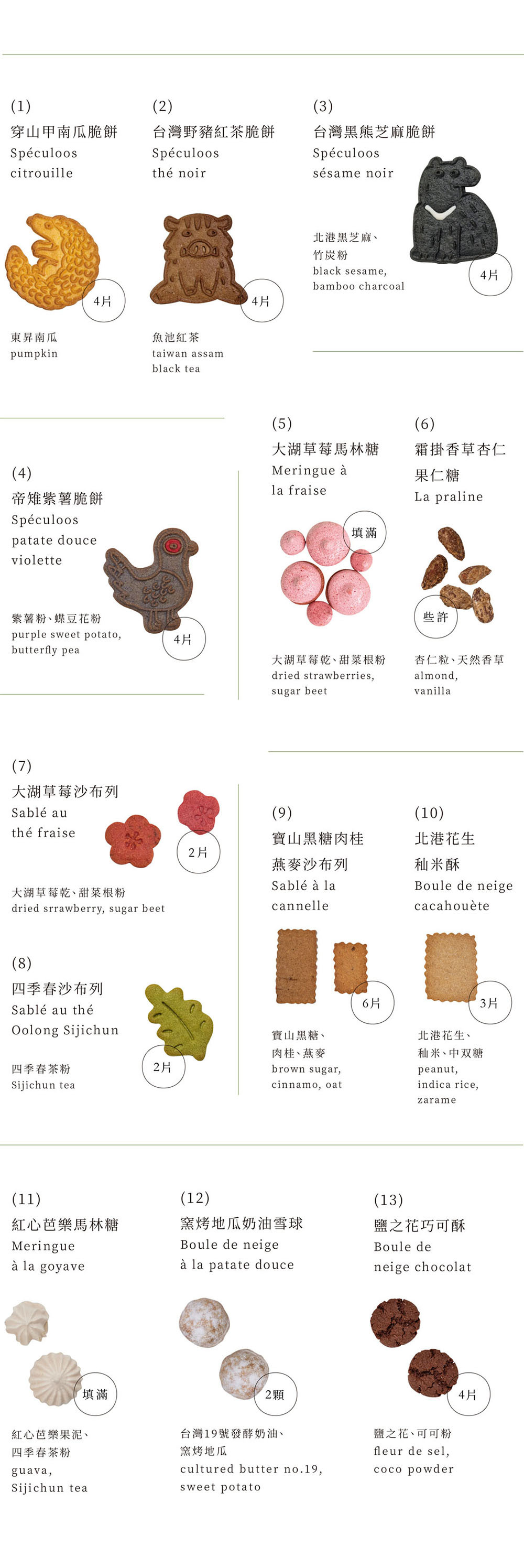 產品成份:低筋麵粉、發酵奶油(乳脂、乳酸菌)、砂糖、高筋麵粉、蛋、海藻糖、杏仁果粒、全脂奶粉、杏仁粉、秈米粉、黑糖、草莓果泥(草莓、砂糖)、紅心芭樂果泥(紅心芭樂、砂糖)、花生粉、無鋁泡打粉(酸性焦磷酸鈉、碳酸氫鈉、玉米澱粉(非基改)、磷酸二氫鈣)、黑芝麻粉、草莓乾、紫薯粉、大豆卵磷脂(非基改)、鹽、南瓜粉、地瓜粉、檸檬汁、大燕麥片、可可粉(可可粉、碳酸鉀)、竹炭粉、甜菜根粉、玉米粉、乾燥蛋白粉、魚池紅茶粉、蝶豆花粉、芋頭粉、肉桂粉、香草醬(砂糖、水、馬達加斯加波本香草精、香草籽)、梔子黃粉末(麥芽糊精、梔子黃)、四季春茶粉