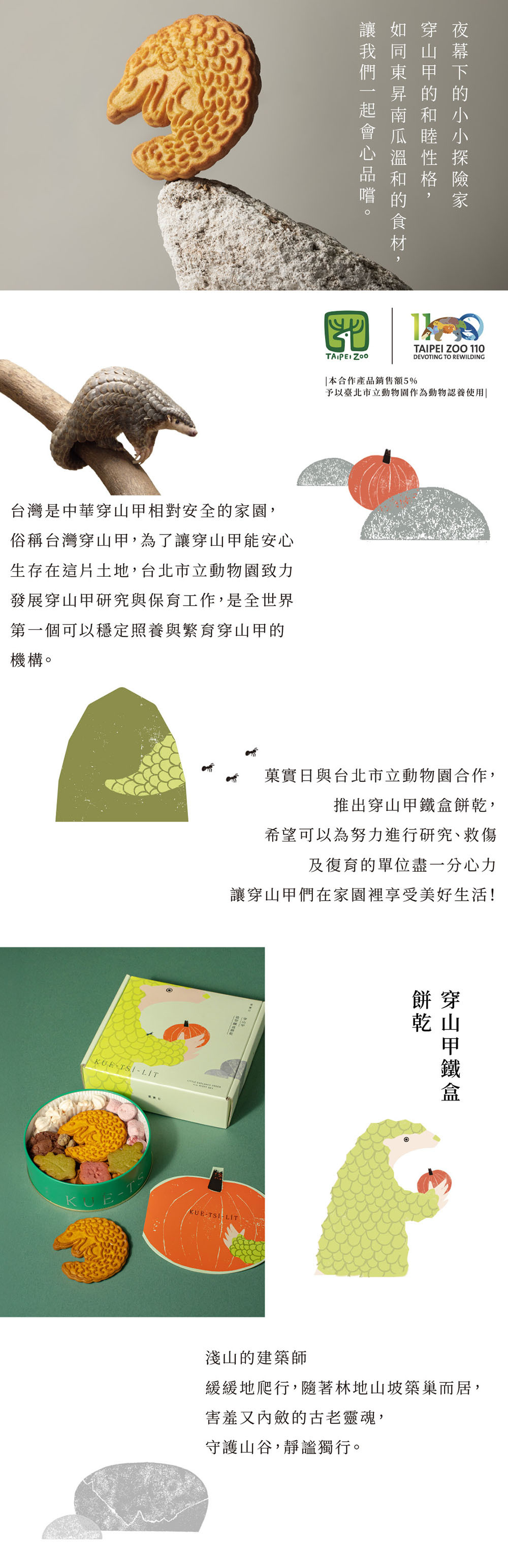 台灣是中華穿山甲相對安全的家園,俗稱台灣穿山甲,為了讓穿山甲能安心生存在這片土地,台北市立動物園致力發展穿山甲研究與保育工作,是全世界第一個可以穩定照養與繁育穿山甲的機構。菓實日與台北市立動物園合作,推出穿山甲鐵盒餅乾,希望可以為努力進行研究、救傷及復育的單位盡一分心力,讓穿山甲們在家園裡享受美好生活!