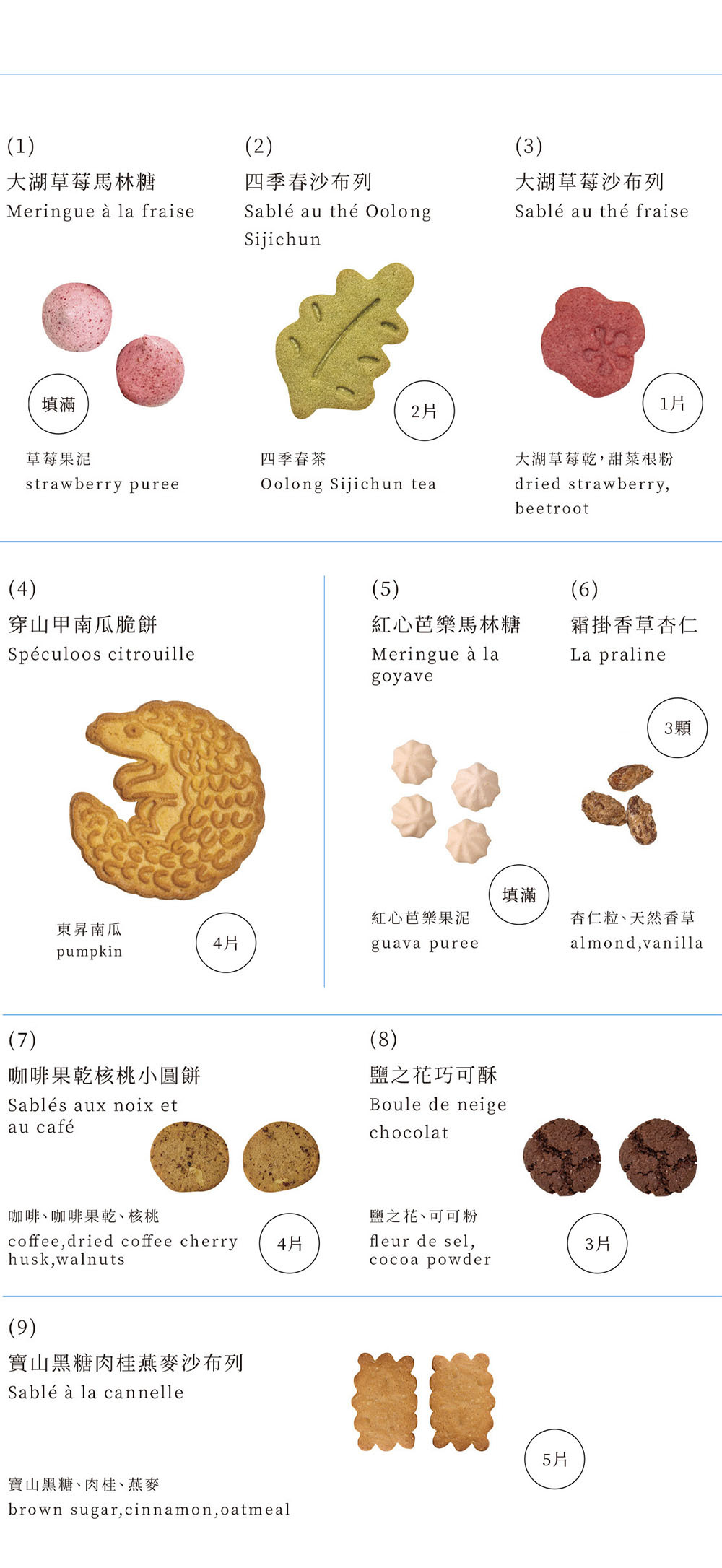 產品成份:高筋麵粉、低筋麵粉、糖粉(砂糖、玉米澱粉(非基改))、發酵奶油(乳脂、乳酸菌)、海藻糖、蛋、紅心芭樂果泥(紅心芭樂、砂糖)、草莓果泥(草莓、砂糖)、杏仁果粒、全脂奶粉、椰子花蜜糖、杏仁粉、黑糖、南瓜粉、檸檬汁、核桃、無鋁泡打粉(酸性焦磷酸鈉、碳酸氫鈉、玉米澱粉(非基改)、磷酸二氫鈣)、乾燥蛋白粉、乾燥咖啡果肉、可可粉(可可粉、碳酸鉀)、大豆卵磷脂(非基改)、鹽、肉桂粉、甜菜根粉、香草醬(砂糖、水、馬達加斯加波本香草精、香草籽)、大燕麥片、濃縮咖啡粉、梔子黃粉末(麥芽糊精、梔子黃)、四季春茶粉、草莓乾